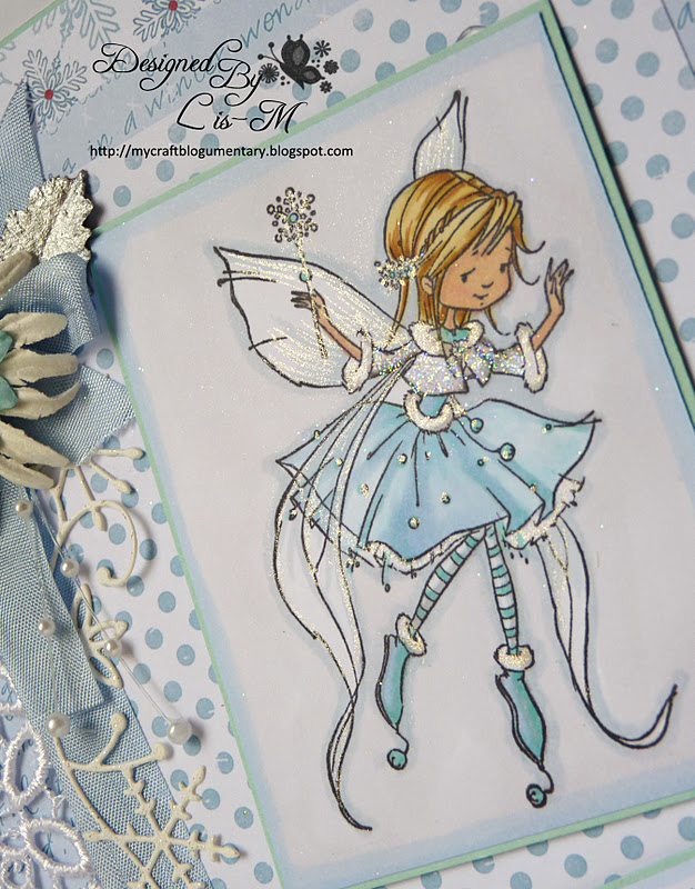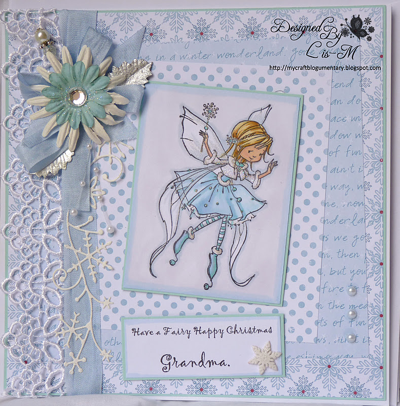 yes... those papers again... winter Wonderland by Martine... They just are so easy to use.... the sentiment is Lili of the Valley... and the image is called "Sassy Sally plays a trick", coloured with my Promarkers.... a couple of snowflakes to finish....