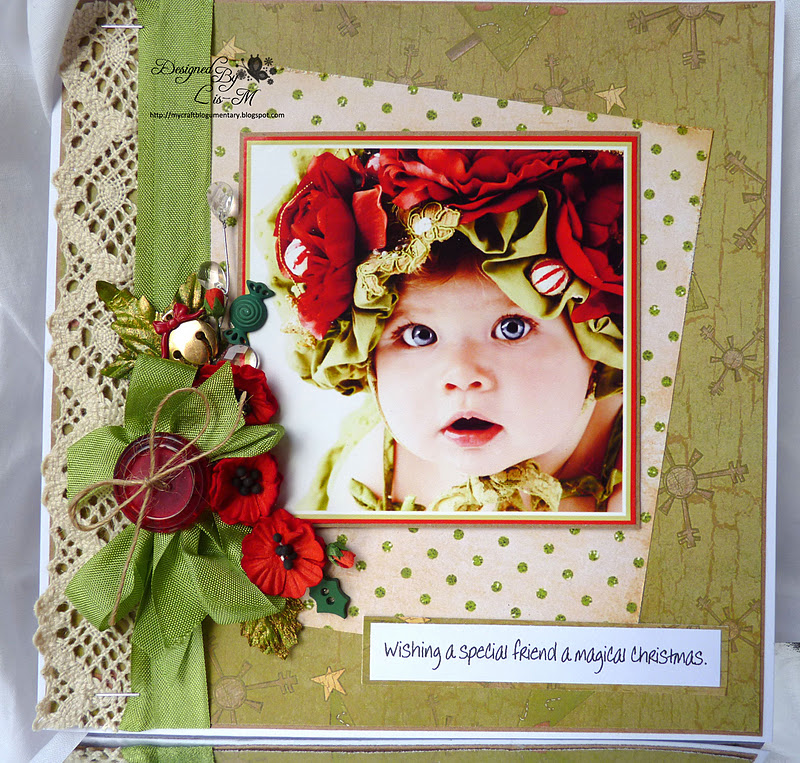 I have coloured fabby Walter "keeping Warm " in his Christmas stocking with my Promarkers... I have cut him out and 3-D'd him on my layout.. I have folded some ribbon to make bows and added some buttons...